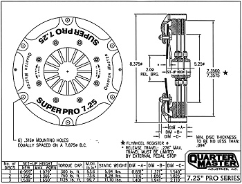 The multi disc race clutch assemblies get pretty fancy but they are well engineered, light weight and in some cases, SFI approved parts. Here is a look at a Quarter Master Super Pro 7.25, 3 disc unit. A clutch like this would be an all custom installation onto a SL6 with flywheel redrilling and some other forms of "re-engineering" work needed. Most of the fast SL6 racers go the extra step of starting with a scatter shield from a V8 and modifying it to mount onto the slant.- DD