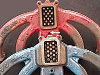 cup-shaped round cast iron washers, cupped faces towards the head.