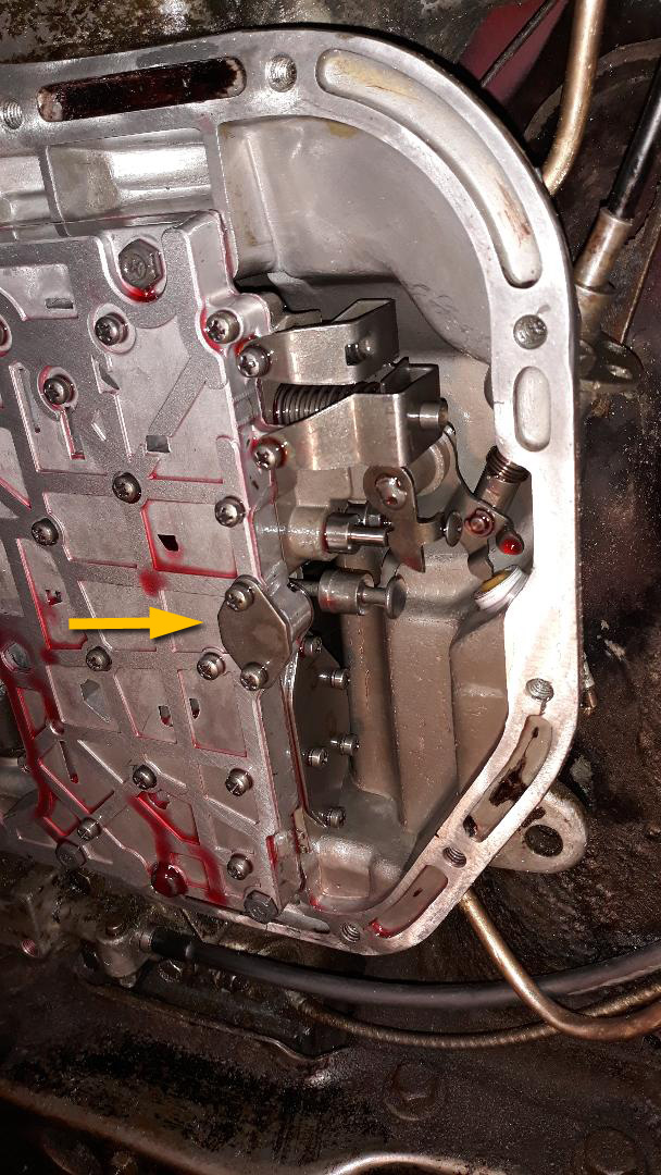 The arrow is pointing to the bottom cover of a part that slides up under pressure and keeps the transmission from shifting into reverse when the vehicle is in motion. When a certain speed is attained, this piece rises up through a pair of slots in the valve body and interferes with the travel of the shift selector valve, thus locking out reverse.