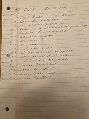 The 83 D150 has accumulated a little over 40,000 miles since its major re new. It has been reliable and efficient and useful, but over time there are wear and tear items that accumulate that need attention. I put together a list of 16 items that I will address over the next month or so. Garage Times are Good Times.