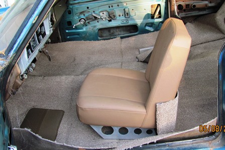 Carpet is going to be a pain. It kind of looks like the driver pad is too far back. If I move the pad close to the area it should be, the edge between the front and rear carpet is under the front seats. Anyway, it will be nice to get the interior at least partly done. One other thing I just noticed. The interior of the car is original 'Fawn' (tanish) color and the outside was originally a sea green. On the inside, with the side panels off, I noticed the rear is the Fawn color but the doors are green color. The doors are the original, as is the interior. Just seems strange.