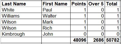No Attendance Points: 34,560 with 1,900 given up to the "Over 5 Rule" for a total of 36,460 round win points.
