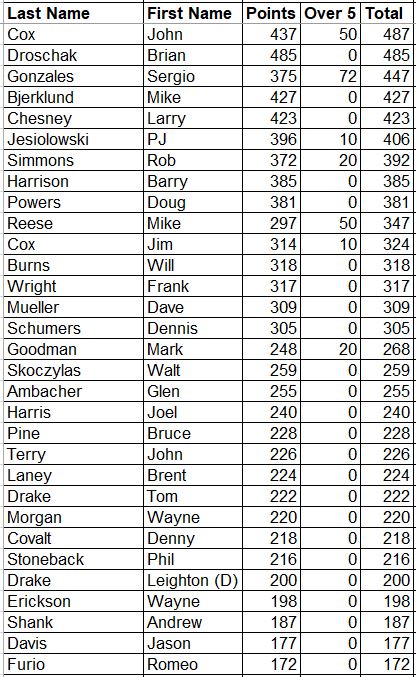 Here are the updated Career Points for everyone. This is every point earned since the beginning with all attendance and record points added.