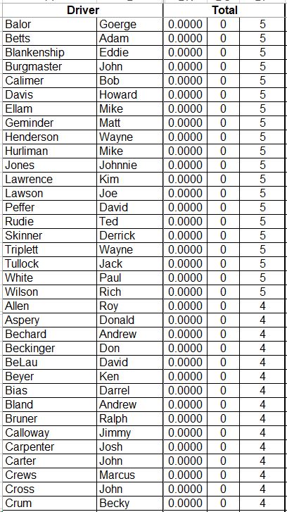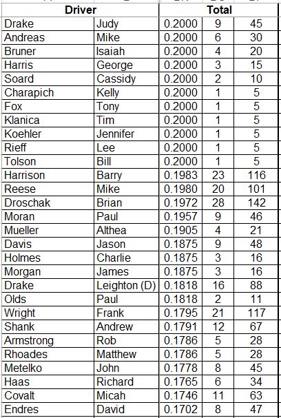 The overall Performance Index for those 394 people, taking into account folks like Ron Hamby all the way down to someone who may have shown up to one race and those who have raced for years and not won a race.... 0.2662 with a total of 3,627 wins over 13,625 rounds raced.