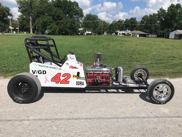 Here is the other Kendall car "Wasted Money III". Dad has done well with it in SDRA. Last year we were points runner-up with the #42. This car was built in the late seventies as a HAMB dragster, but later converted to an SDRA car by adding some roll bars and an automatic trans. Dad has upgraded it little by little and now it can run below the SDRA index (1/4 = 11.50, 1000ft = 9.50, 1/8 mile =7.20)