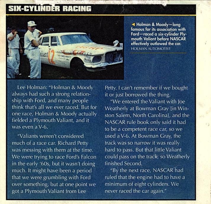 The Valiant has to be a slant 6. I think the author Lee Holman was a kid or not even born when Holman & Moody joined the slant 6 family. He assumed it was a V6.