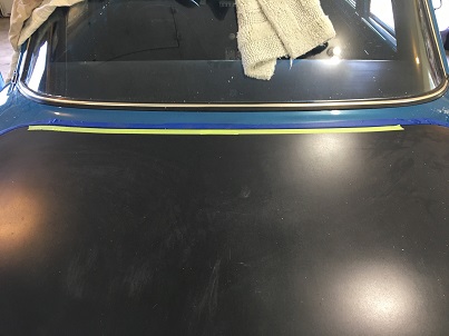 I got the trunk lid all done today. Trimmed about 1/8" off the back edge where the green tape is shown. Put a small tab in the center underside for the prop rod. Also put some round rubber washers between the hood pins and the deck lid to protect the paint when completed. Then I block sanded the whole thing and it was amazingly flat. :D :D Now it is up to the paint man when he want the car. :D :D