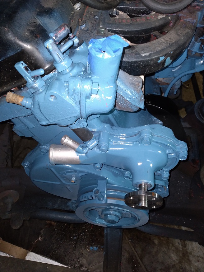 The last week, and today, we got all of the old, probably factory, gasket material from around the timing cover and water pump. That was a lot of work. Wound up using my right-angle drill with a cup brush, and it was slow going. Last Thursday we tried installing the timing cover, but couldn't get the two dowel pins through the holes in the cover. Only way I could figure out how to do it was by dropping the oil pan slightly. Friday my grandson got underneath and loosened the pan bolts about 2 turns. Had to raise the engine a little and remove the driver's side motor mount bracket to access a few of the bolts. Today we were able to drop the front of the pan just enough to seat the timing cover. Then we proceeded to install the new water pump and bypass hose (with worm-style clamps), and the new 180 degree thermostat. Hopefully tomorrow we can repaint the front of the engine Chrysler blue, along with some other areas we can get clean enough.
