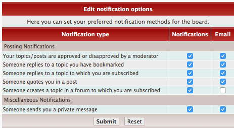 * Under Edit notification options i have the Email boxes checked for ALL options except Not “Someone creates a topic in a forum to which you are subscribed.” So, it IS checked for both Someone replies to a topic you have bookmarked and Someone replies to a topic to which you are subscribed