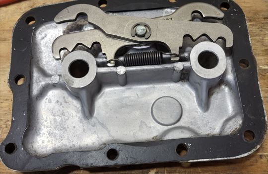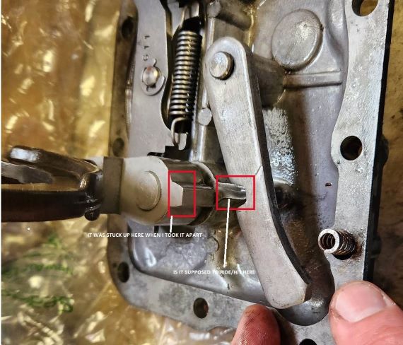 Question for someone, I have an A833 OD (behind my slant) with the interlock lever cover (later style) and my reverse switch isn't activating because the reverse interlock link isn't hitting it. When I popped the cover off it was jammed up on the shift lever not coming down. My question is the notch in it supposed to be hitting/riding on the shift lever or hitting/riding on the built in casting near the shift lever (see pic).