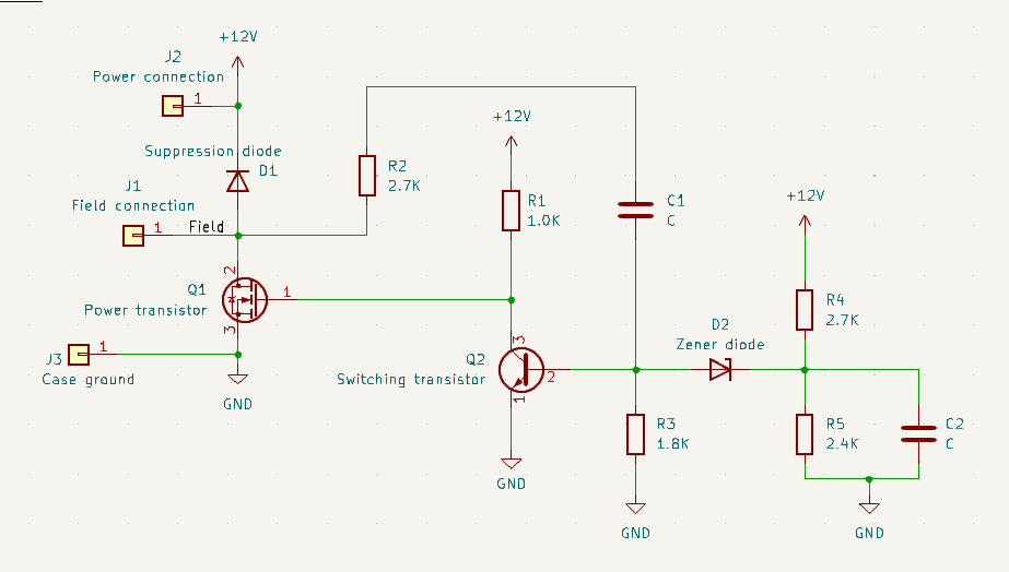 This is a very simple circuit, using a large power transistor and a smaller transistor to switch the larger one. The switching transistor is controlled by a Zener diode, Z1 on the circuit. When the voltage rises high enough, it flows through the zener diode and turns on the smaller transistor, which switches the large one off. When the voltage is low enough, current through Z1 shuts off, the large transistor switches on, and grounds the field coil. There is a capcitive coupling between the output of the power transistor and the switching transistor that limits the maximum switching speed. The reason for this is that switching off the power transistor creates a large voltage spike, which the D1 diode dumps back into the supply voltage. If the switching is too rapid, this will send too much current through D1 and can burn out D1, or even the 12 volt feed wire.