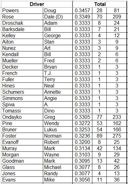 The overall Performance Index for those 394 people, taking into account folks like Ron Hamby all the way down to someone who may have shown up to one race and those who have raced for years and not won a race.... 0.2662 with a total of 3,627 wins over 13,625 rounds raced.