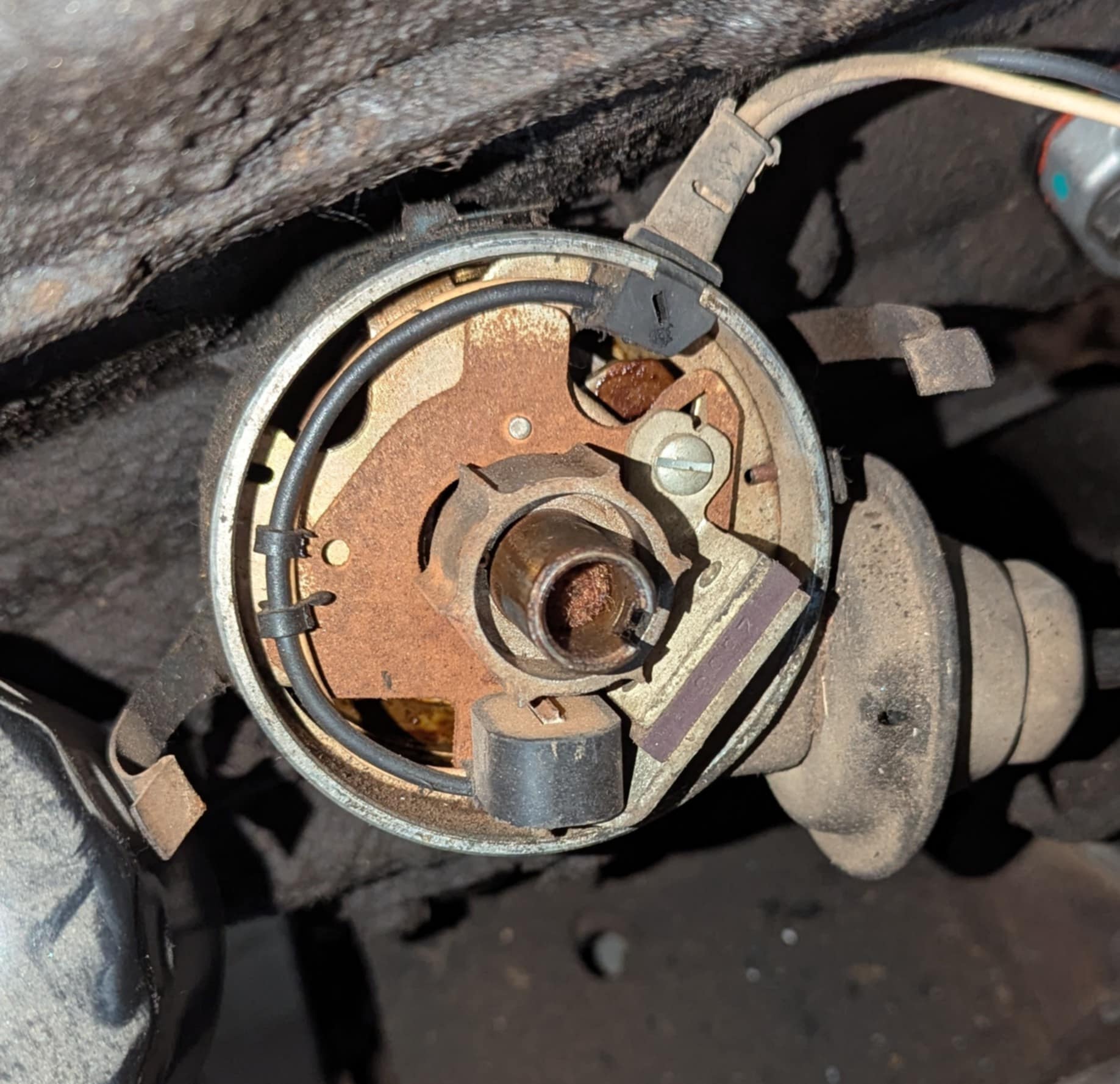 There's nothing evidently the matter with the distributor; that surface rust won't hurt anything. Pull it and lube the slide pads that enable the uppper plate to move versus the lower one, and lube the advance weights, and put the dist back in.