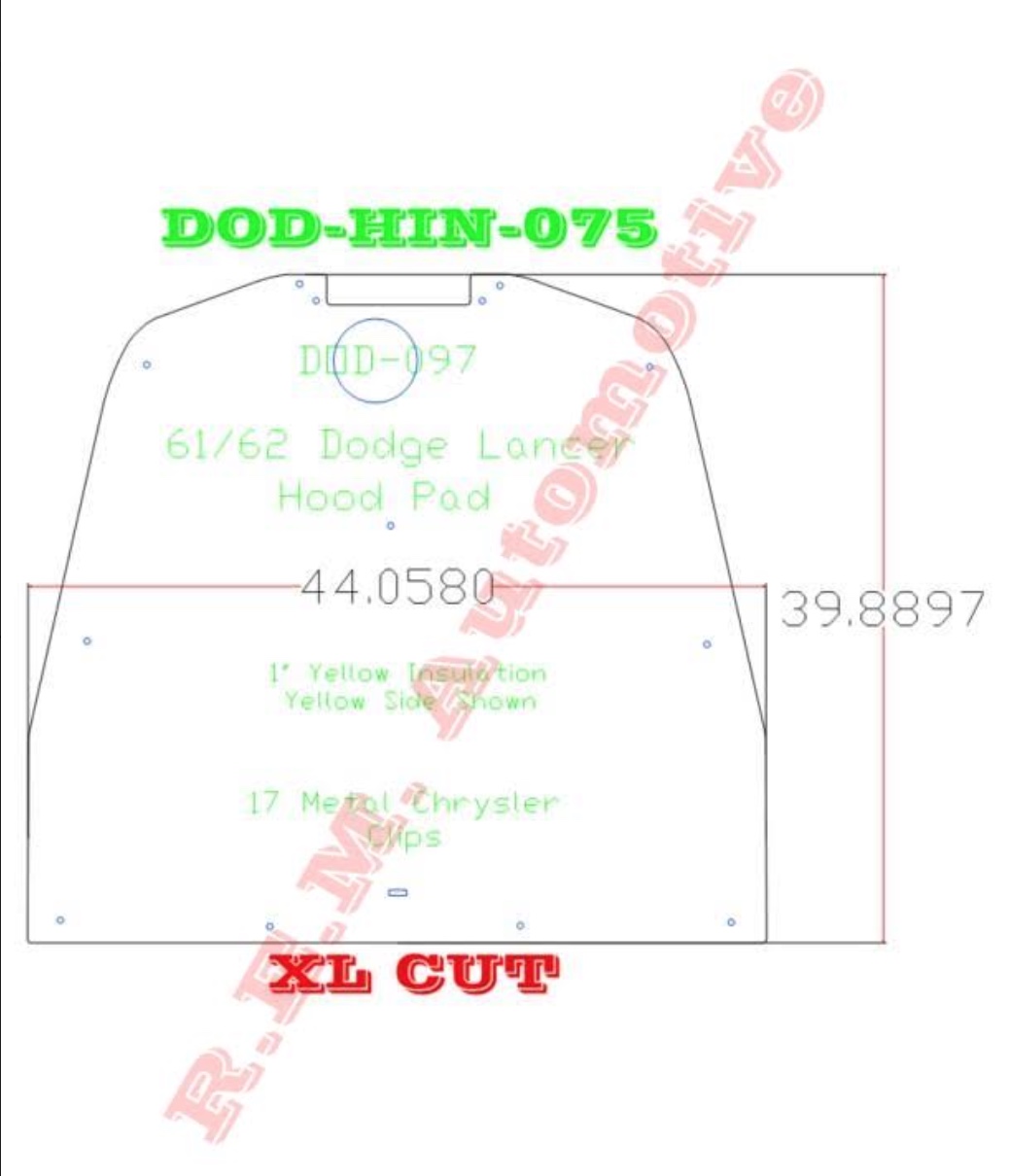 Repro pads are readily available in North America from REM Automotive, listed in the parts sources post. Part number is PLY-HIN-040 or DOD-HIN-075; same item under two different part numbers. No die cuts for the hood webbing. Shop around; different REM dealers have different prices on it.