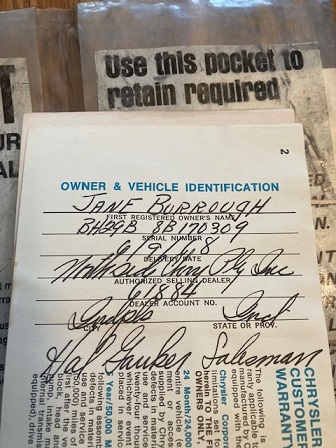 The owners manual lists the: buyer, date sold, dealership and the salesman. There is an interesting warranty disclaimer on the pouch, to keep the warranty in effect the cars owner must present all receipts for service and repairs to the dealership on the anniversary of the sales date.