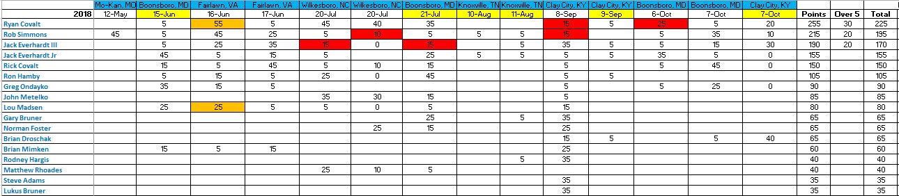 Over 5 Rule: Once you’ve won rounds at 5 events you start giving up points. You use the points for your best 5 events only. Everyone except Jack E. Jr. has won rounds at 5 or more events.