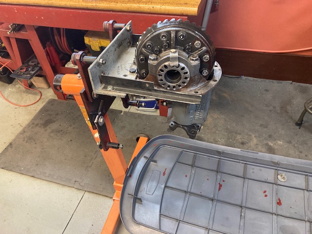 Sure is nice when a plan comes together. I eyeballed the tilt and clocking of the axel housing mounted in the 68 Barracuda and made a platform to hold the assembled 742 differential on my floor jack to match that tilt and angle. Strapped the housing to the platform and rolled it under the car, lifted the differential with the jack, rolled the jack back and BOOM, it was in, it may have taken me more time to type this than to get the differential back in. That was nice.