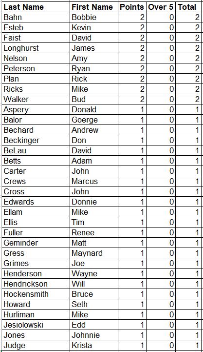 Here are the updated Career Points for everyone. This is every point earned since the beginning with all attendance and record points added.