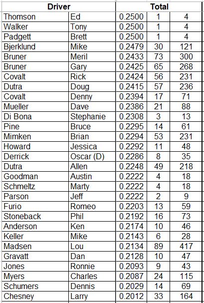Mike and I may have been a little higher in pct. if it wasn't for the fact that almost every race we went to we ran each other in the 1st or 2nd round. We were about 50/50. |