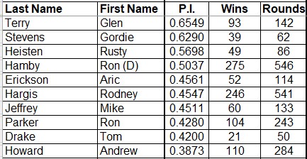 Thanks, Rob! Very interested numbers to consider. Ron Hamby is the king seems to be the first punchline... It's fine to have a high index with only 50 or 100 rounds. A high index with 300-500 rounds is quite another thing. Lou |