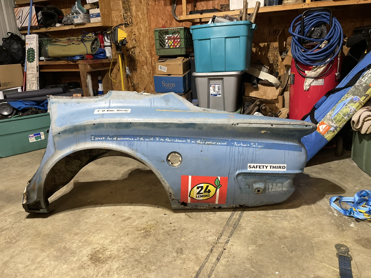 We saved what we could from the carnage. That roll cage Adam built did NOT want to come out, but we finally got it. I saved the only corner that survived for wall art. Adam got the trunk lid…