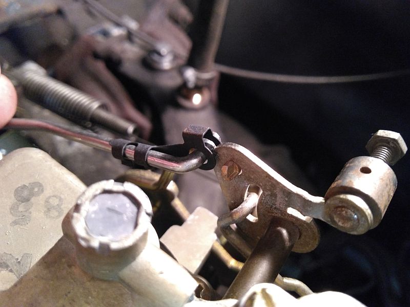 Ah. You have the choke thermostat rod in the hole for the fast idle cam lnkage and someone has straightened out the eyelet bend for the choke thermostat and affixed a manual choke clamp to it. You can try bending the eyelet back over so it looks like the one I posted.