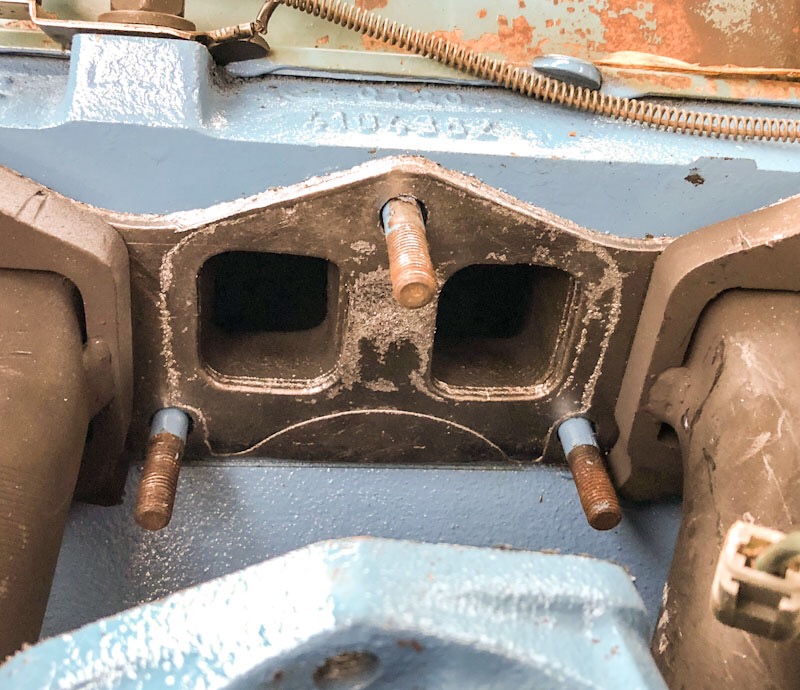 Update on this project (or, What I Did on My Summer Vacation): Clifford shorties are installed; while I had that side of the engine available, I cleaned it up and gave it a new coat of blue paint. I got a 2-1/8 diameter kit from Speedway, got all the pipes cut, welded up and hung up. At the stock location near the trans mount, I fabbed up a longer bracket to hold both sides of the pipe then built a mirror image of the stock hanger to fit in the driver side. Painted the intake, used a Remflex gasket, created a bracket for the choke. And new motor mounts plus a “mini-starter”. Finally, put in tail pipes to put the exhaust out both sides behind the tires.