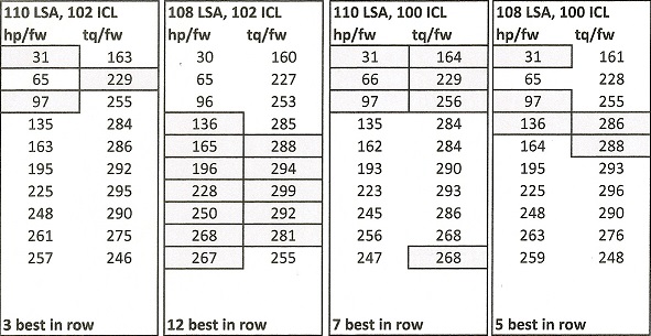 note that the peak torque for the 106 LSA 102 ICL occurred at 3500 RPM, in fact