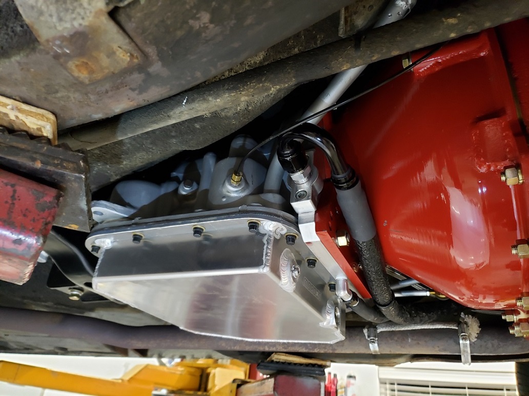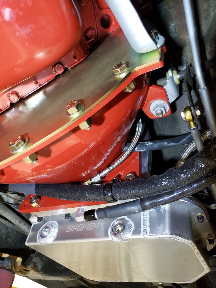 The bell is the QT one I modified for the 10.5" clutch / 130 tooth 30lbs Schiefer flywheel. I also had to add the mounting tab for the column shifter linkage lol. The clutch is the basic McLeod 75109 diaphragm type. As it sits, I could remove the 904 and install an 833 without touching the bellhousing forward. The engine-bell bracket was graciously donated by Rob! The 904 is actually a 998 and I used most of the usual HP parts as well as turning the TC feed passage into a 7th pump bolt. The front pump is no longer there...I use the KRC pump driven off the crank. The original PS pump had to move up to make room so I switched to a Saginaw PS pump while I was at it. The trans is 3" rearward compared to stock so the driveshaft had to be cut accordingly.