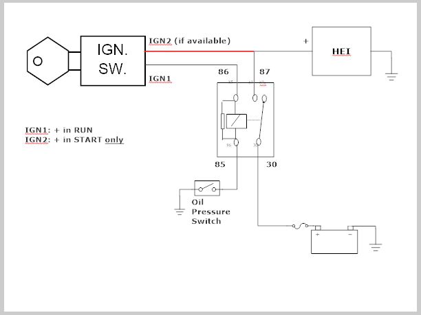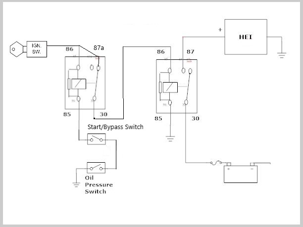 What do we do? Change the switch to one that opens on low pressure to de-energize the HEI relay or add a second relay as a cut-out. This is the second diagram. Cut-out relay is on the left. Circuit operation is like this... With the ignition switch on and bypass switch open the ignition will always have power through the cut-out relay's normally closed contacts. With the ignition on, bypass switch closed and the oil pressure switch closed the relay will energize and open the contacts killing control power to your HEI relay. Open the bypass switch or oil pressure switch the relay is de-energized and ignition switch power passes to the HEI relay.