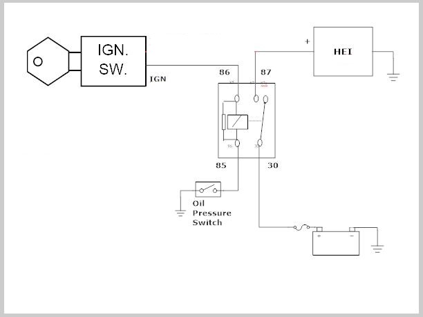 Fused power goes to the input relay (switched) contacts. The HEI power is connected via the Normally Open relay contacts. The relay is controlled by the ignition switch (Run) for power to the relay coil + and the relay coil ground - is routed, through the oil pressure switch contacts, to ground. This way, if oil pressure drops, the ground to the relay is removed and the ignition is cut off. I will try to draw up a schematic which might make this a little easier to see.