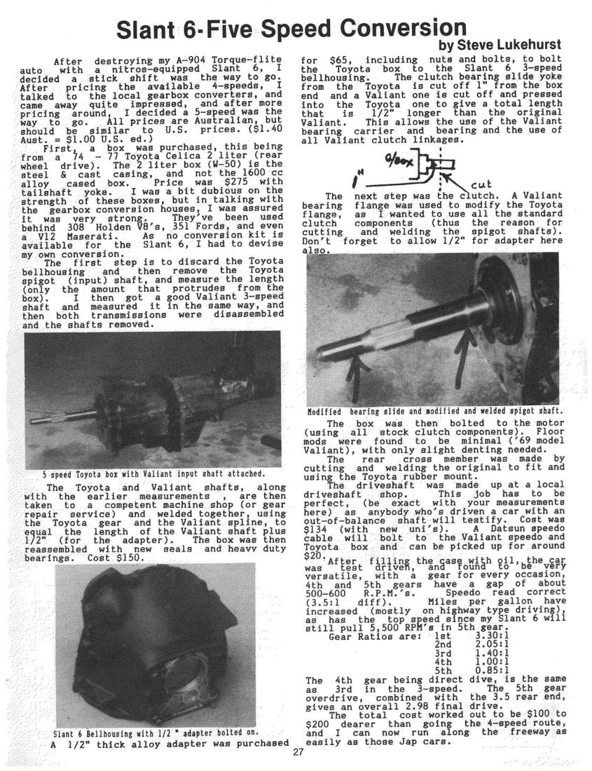 After searching the web for possible 5 or 6 speed conversions I found an old thread on this site and went to Dellow conversions. It seems they may still produce a cast iron bell for a slant to a Supra 5 speed. It is on back order but the idea of a right hand drive bell seems awesome to me. With a hydraulic clutch on the right side it would leave plenty of room for exhaust on a normally cramped left side.