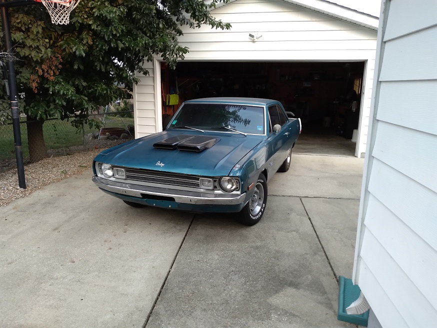 My name is Chuckster. My 14 year old grandson, Logan, recently bought a '72 Dart Swinger 2 door as a project him and I will work on so he can drive it when he turns 16. We live in central Illinois. We (grandson, my daughter, and I) drove just over 3 hours north to Marengo, IL. to look at it, bought it, and drove it home! We passed the Chrysler plant in Belvidere to get there. Only issue we had was a possibly factory spring clamp on the bypass hose rusted in two, causing an anti-freeze containment issue. Once we replaced the clamp (by bypassing the heater core to borrow a clamp) and adding water we made it home without any issues. It's a factory A/C car (but all under-hood items are missing), power steering, manual disc brakes, and someone recently converted it to Electronic Ignition. It does have some rust, but it was undercoated when new, so it doesn't appear to be too bad for a car that has lived in Illinois it's whole life!