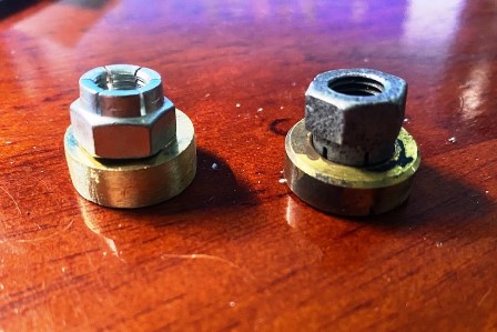 The one on the left is aftermarket, the nut is straight (no taper) and the washer has a bevel in the center for the nut.