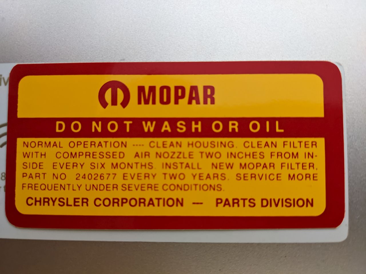The worn decal I took off the side has "MOPAR AIR CLEANER PART NO. 2402704" on top above the "DO NOT WASH OR OIL". I have a repro side decal with "MOPAR" on top and "DO NOT WASH OR OIL" under that. it's not the same exactly. Also, I need to get the "CHARGER 225" decal for the side.