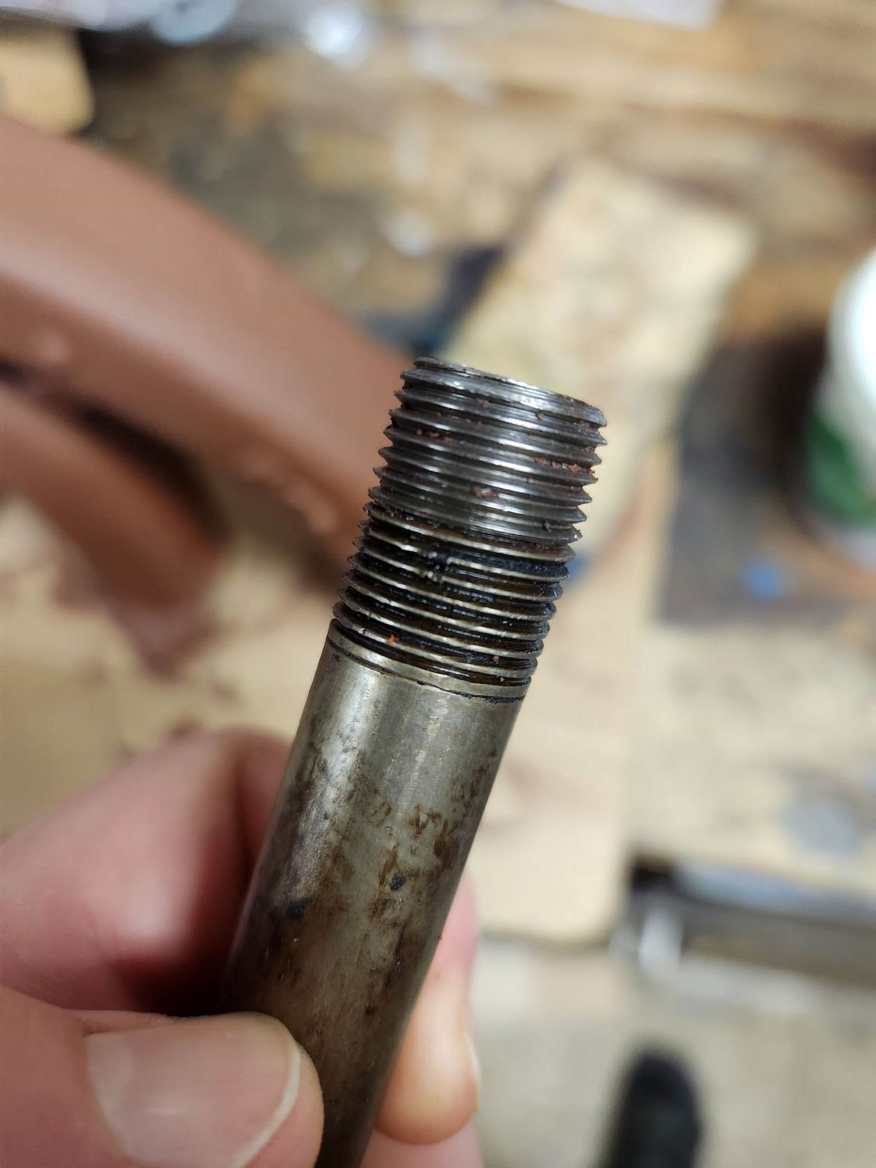 I believe its to short because it has to be screwed in farther to tighten cause of the thread stretch. This is what it looks like, i was trying to find a die nut to try to salvage it. Just not sure of the size pipe thread, was hoping someone knew for certain.