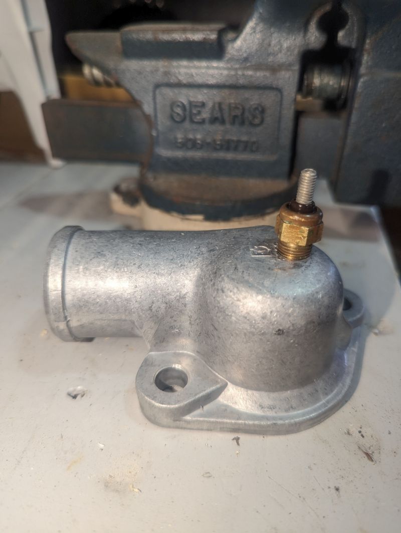 …a 1/8" pipe thread hole in the bowl portion of the thermostat housing, and install your sender there. Nice thing about doing it this way is you get to "see" the thermostat open.