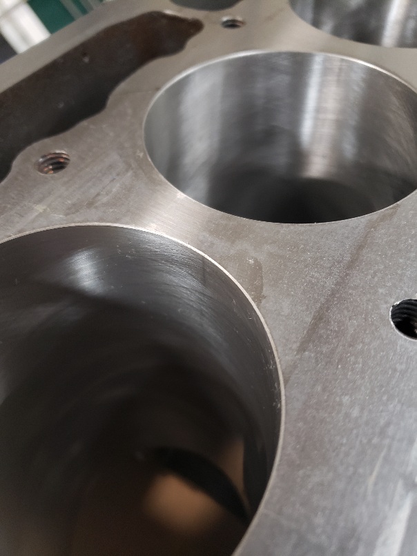 The chamfer reduces the possibility that a small burr could be kicked up in handling or assembly. An edge break is all that is needed. A good sized chamfer is needed a the top of the cylinder bores to help guide the piston rings In during piston insertion. If a lot is cut off the head / block be sure to verify that the head bolts don’t bottom out. Hardened washers can be set in under the bolt head to restore the proper bolt depth. |
