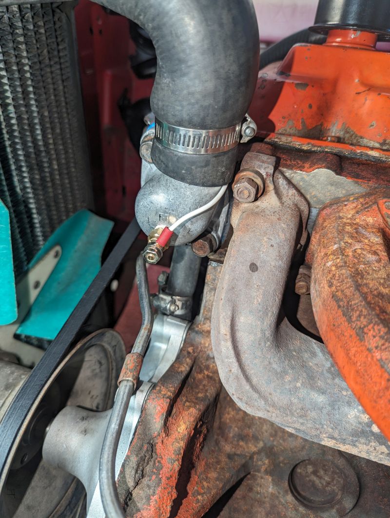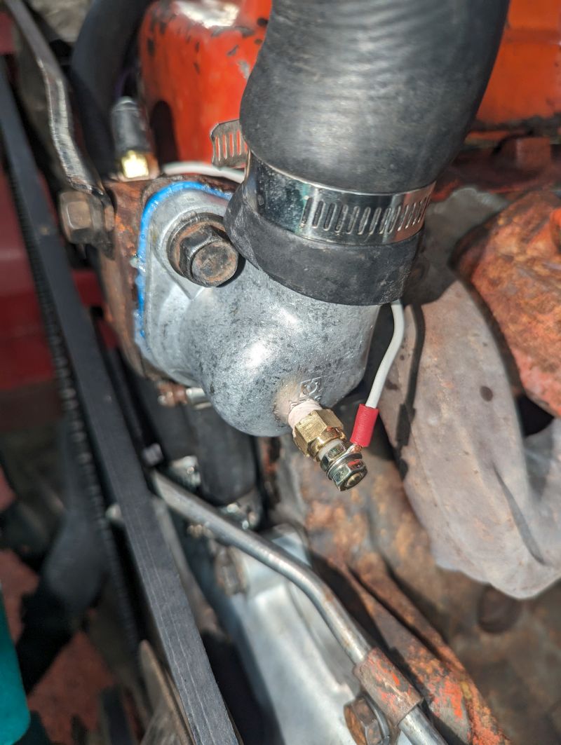 …a 1/8" pipe thread hole in the bowl portion of the thermostat housing, and install your sender there. Nice thing about doing it this way is you get to "see" the thermostat open.