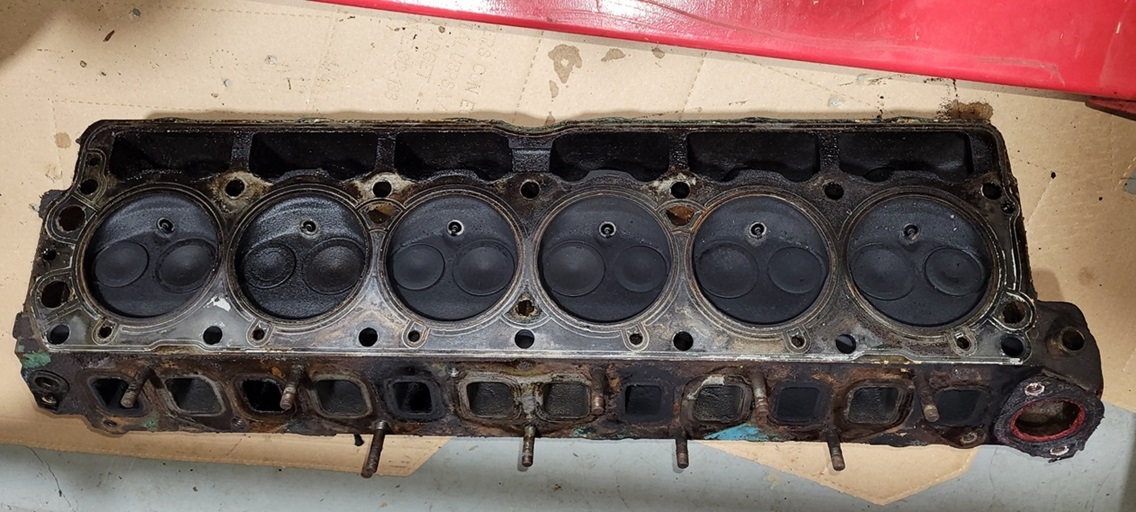 I'm down to just the head bolts. Have to loosen them and then maneuver my hoist through my crowded garage. Not going to attempt just heaving that head out of there. Appears there was lots of rust under the valve cover that came off when I whacked it with a rubber mallet to break it free.