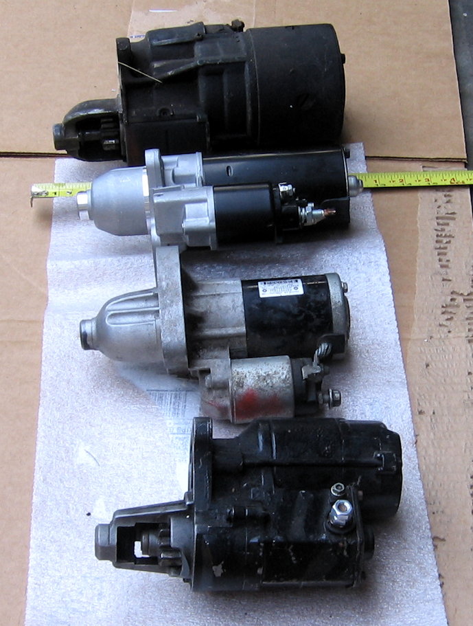 Its main body is ~same diameter than the other starters, and slightly longer than the 56029274AA '05-'08 Ram Hemi/MT starter made by Mitsubishi (not as much longer as it looks; the different division between steel motor frame and aluminum front casting creates the illusion of much longer). Its solenoid is clocked such that on a Slant-6 it protrudes outboard more than the block-hugging one on the Ram Hemi starter. Cranking speed (i.e., starter torque) is audibly higher than any other starter I'm aware of that'll fit a Slant-6; the nominal rating is 1.8 kW, which is a whomping 2.4+ horsepower. Compare the first-design Chrysler geared starter (1.3 hp), the second design (1.5 hp) and the extra-big 3rd design (1.8 hp), and the Nippon/Denso at 1.9 hp. The Hemi/MT item is 1.7 kW (just under 2.3 hp). So you're gonna win the starter-horsepower bench race every time. One advantage of this starter over the Hemi Ram item is that it just bolts right on. Drop in and go. You don't have to drill out threaded holes or buy a special countersink bolt as the Hemi Ram starter requires. Should you buy one? Well…h'm. Do you want one? Pics (Chrysler, Bosch, Mitsubishi, Nippon/Denso): Attachment: