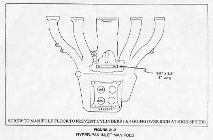 ------------------------------------------------------------------------- Package: Hyper Pak Four-Barrel Carb.: Carter AFB 3083 PN 2129881 (No Longer Available) Manifold: Chrysler Aluminum Hyper Pak (No Longer Available) Manifold Modifications: See Figure 21-2. Carb Specifications: Carter AFB Throttle Bore: 1-7/16 x 1-9/16 Venturi: 1-1/16 x 1-1/4 Primary Jet: 120-389 (.089) Throttle Side Choke Side Secondary Jet: 120-350 (.050) 120-365 (.065) WOT PT Metering Rod: 16-51 (.060 x .065) Float Setting: 9/32 Inverted - Measured from float bottom to gasket. Accel. Pump Shooter: .028 Idle Feed: 035 -------------------------------------------------------------------------