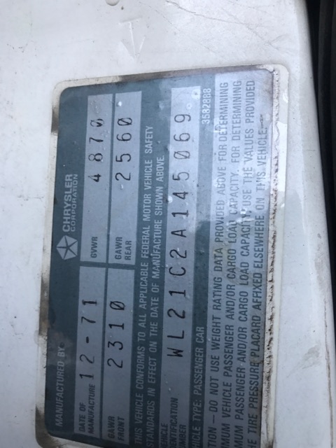 Car Model: 1972 Dodge Charger Slant 6
