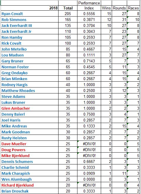 Sorry for the delay. Here are the updated points adding the four racers that got attendance points for Sunday of Clay City, record points for Wes Alumbaugh and the three racers at Sacramento.