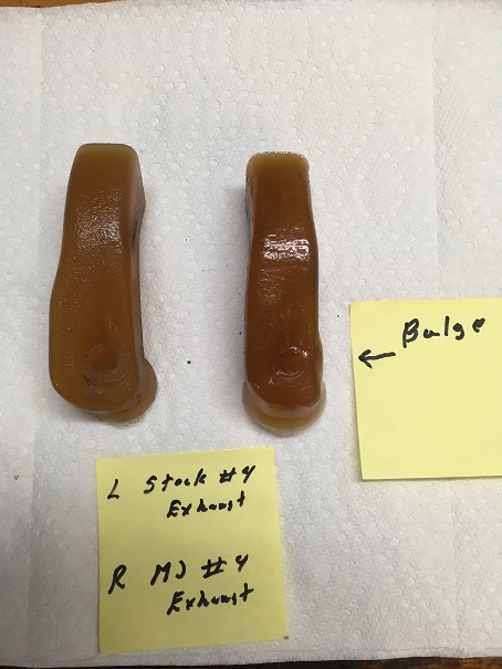 The molds were of the intake and exhaust ports of the MJ ported head and a stock 1987 slant head. Compared the two with using caliper measurements and visual inspection. Dimensionally and visually it is obvious there was a lot of bowl work, almost no change in the port arms.