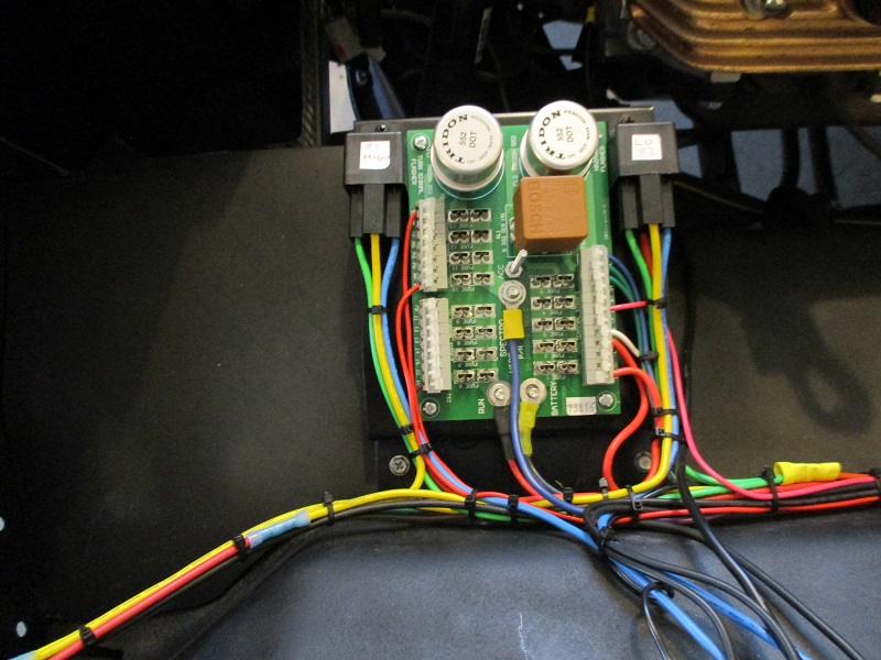Another photo shows the front fuse/relay module and the headlight relays mounted in the original battery location. The console contains another fuse panel along with the seat belt control module and inertia switch.