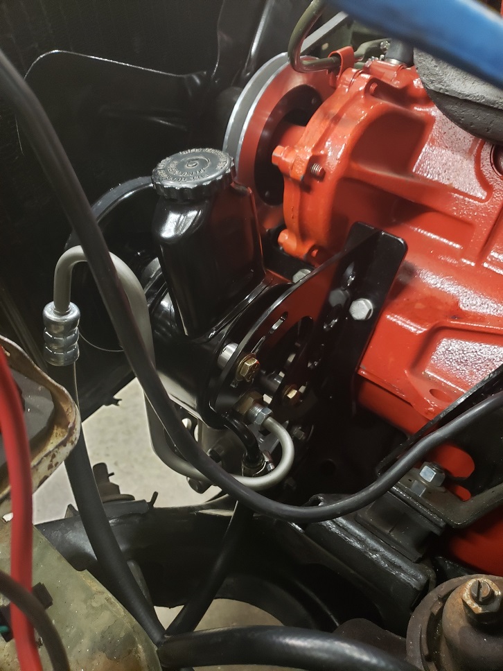 The bell is the QT one I modified for the 10.5" clutch / 130 tooth 30lbs Schiefer flywheel. I also had to add the mounting tab for the column shifter linkage lol. The clutch is the basic McLeod 75109 diaphragm type. As it sits, I could remove the 904 and install an 833 without touching the bellhousing forward. The engine-bell bracket was graciously donated by Rob! The 904 is actually a 998 and I used most of the usual HP parts as well as turning the TC feed passage into a 7th pump bolt. The front pump is no longer there...I use the KRC pump driven off the crank. The original PS pump had to move up to make room so I switched to a Saginaw PS pump while I was at it. The trans is 3" rearward compared to stock so the driveshaft had to be cut accordingly.