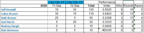 The next and only other currently scheduled race is Clay City, KY 11-12 September. We may have a final race added at Mason-Dixon, MD on 10-11 October, but it isn't likely.