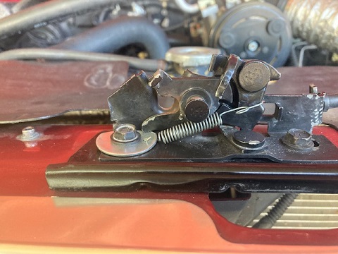 Added a spring to do a temporary repair. The spring pulls and holds the dog leg latch into position when the hood is closed.