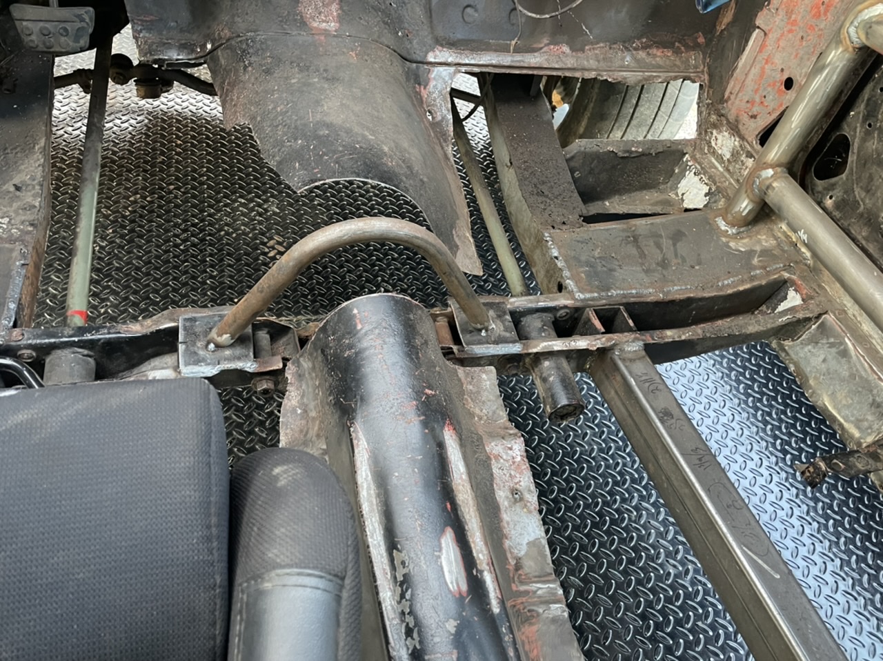 Nice!! Note that a T5 on a 63-66 A-body needs most of the upper X-member cut out, and at least 2" of the very top of the X goes away. Rebuild with rectangular box tubing. I can give more direction later...
